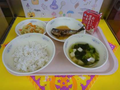 今日の給食は、麦ごはん・牛乳・いわしのかわり煮・キャベツのごま煮・すまし汁でした。