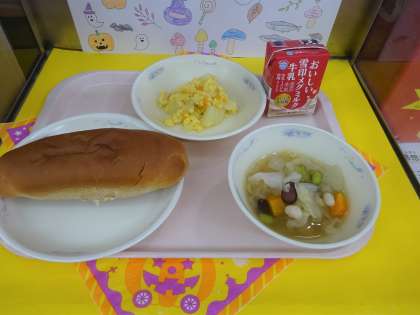 今日の給食は、黒糖コッペパン・牛乳・ベーコンとポテトの変わりオムレツ・野菜のスープ煮でした。