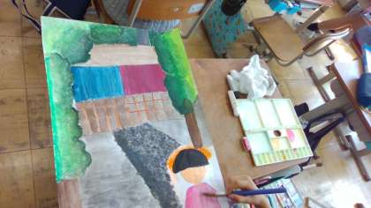 5年生 図画工作科「言葉から思いを広げて」 公開日 2023/10/03 更新日 2023/10/03 5年生のページ 読み聞かせを聞いて絵にあらわす学習をしています。絵の具で色をぬり、もうすぐ完成です。