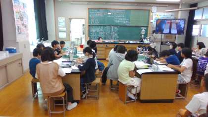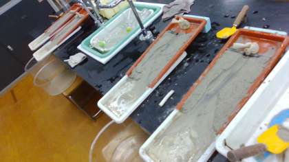 流れる水のはたらきについて調べるために実験をしています。実験を通して、流れる水には、浸食、運搬、堆積の三つのはたらきがあることを学習することができました。