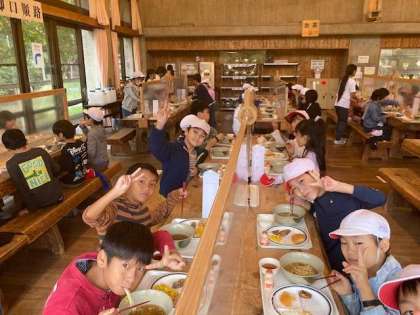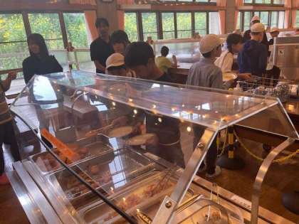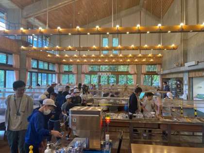 昼食はラーメンと、バイキングでおかずを選んで取っています。まだ活動前ですが、みんなお腹がすごく減っているようです。活動に向けてしっかり食べましょう。