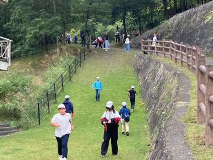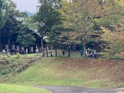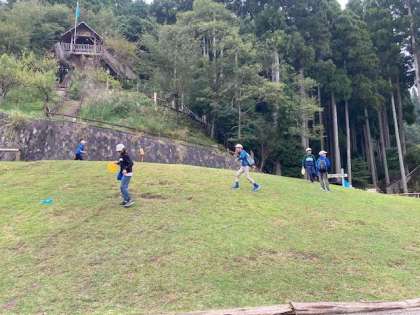 昼食後、フライングディスクゴルフをグループでしています。少し小雨が降ってきていますが、このままもってほしいです。