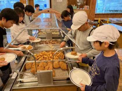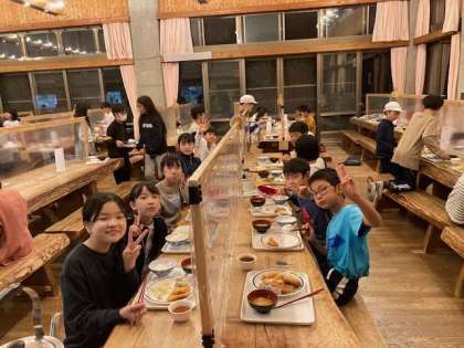 1日目の夕食です。たくさん活動したので、みんなよく食べています。栄養バランスも考えていろいろなものを選んでとれています。このあとはナイトハイク、星空観察へ行きます。