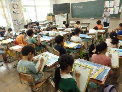 図画工作 ことばから形・色 鑑賞 公開日 2023/10/04 更新日 2023/10/04 3年生のページ 図画工作では、お話を読んで自分が想像した世界を絵に描きました。作品を鑑賞をするなかでそれぞれの作品の良さや自分の工夫した箇所についてしっかりと考えていました。