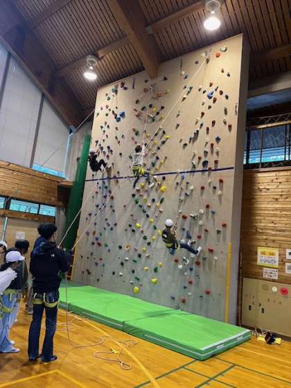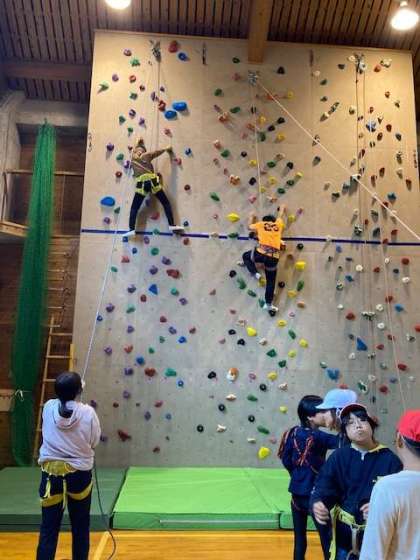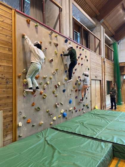 午前中は天候が回復しなかったので、プレイホールでボルダリングやクライミングをしました。クライミングはハーネスをつけて、かなり高いところまで頑張る子もいました。