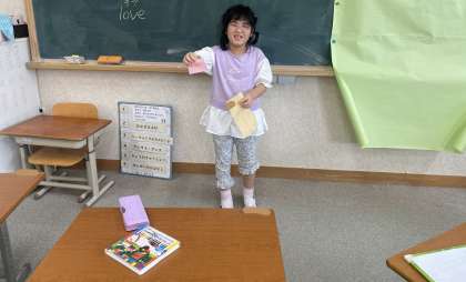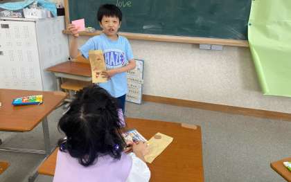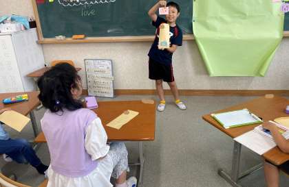 おひさま学級 「私の好きなものは○○です」 公開日 2023/10/05 更新日 2023/10/05 おひさま学級 外国語活動、外国語の時間に、自分の好きな物をカードに描き、そのカードを相手に見られないように封筒に入れ、友だちの好きな物を英語で質問しながら答えを当てるゲームを行いました。正解すると、封筒からカードを取り出し、「I like」を使って、自分の好きなものを英語で発表しました。友だちの好きなものを知りながら楽しく英語で伝え合うことができました。