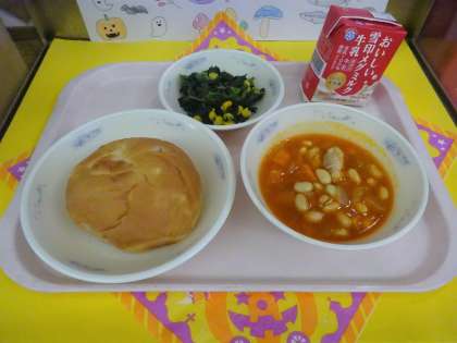 10月13日(金)の給食は、おさつコッペパン・牛乳・大豆と鶏肉のトマト煮・ほうれん草のソテーでした。