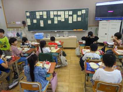 さばのしょうが煮は、大きな背骨や腹骨もあります。箸を使って綺麗に食べられるように頑張っていました。魚の骨が取りやすいように、箸で切れ目を入れる場所を考えていました。おいしくいただきました。