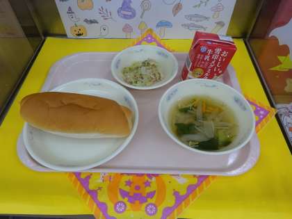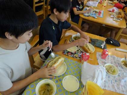 今日の給食は、コッペパン・牛乳・ツナサンドの具(フレンチ味)・スープでした。コッペパンに、自分で切れ目を入れてツナサンドの具を挟むセルフサンドでした。自分で作るオリジナルのツナサンドを楽しく食べられたようでした。
