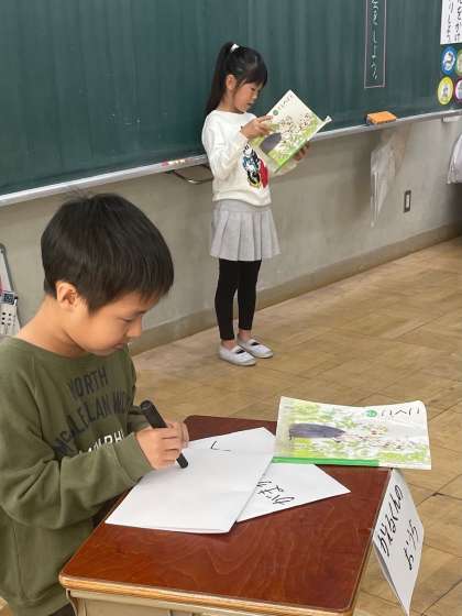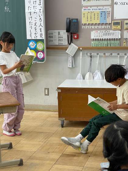 【2年生】音読発表会 公開日 2023/10/18 更新日 2023/10/18 2年生のページ 音読発表会 自分たちの工夫をこらして 音読発表会をしました。 寝転がるがまがえるくんに お手紙を書くかえるくん しっかり地の文を読むナレーター どの役もしっかりと読むことができました。