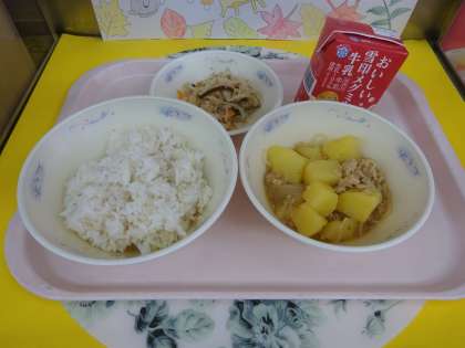 給食の献立は、麦ごはん・牛乳・じゃがいものそぼろ煮・切干大根の三杯酢でした。北海道産のじゃがいもを使い、鶏ひき肉や玉ねぎ、糸こんにゃくも入っており、片くり粉でとろみをつけています。じゃがいもがホクホクしており、そぼろもとろっとしていて子どもたちからも好評でした。
