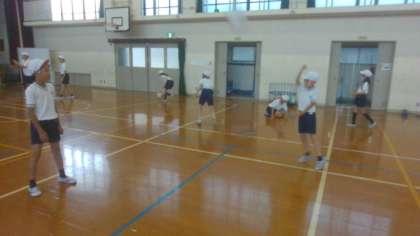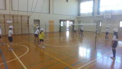 体育科の学習では、ソフトバレーボールの学習をしています。自分たちでどのようにすれば得点が入るかチームで話し合っています。また、「ドンマイ」「ナイス!」などチーム内で声をかけ合いながら試合を進めています。