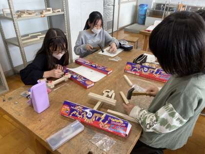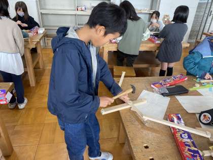 図画工作科の学習では、のこぎりを使い終わった子どもたちは、釘を打ち始めました。手に打たないように慎重に打つことができました。もう少しで出来上がりですね。