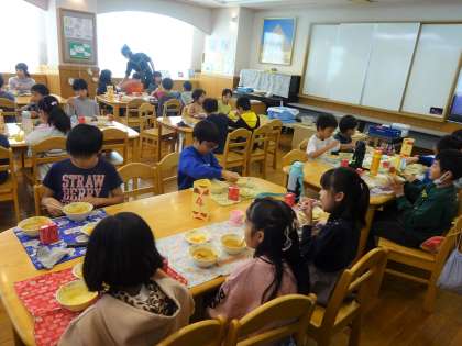 11月17日(金)の給食は、玄米ごはん・牛乳・チキンカレー・カラフルホットマリネでした。カラフルホットマリネは、キャベツ・にんじん・コーン・枝豆が入っており、その名の通りカラフルで見た目にもおいしい一品でした。色合いを楽しむことができるのも野菜の良さの一つです。