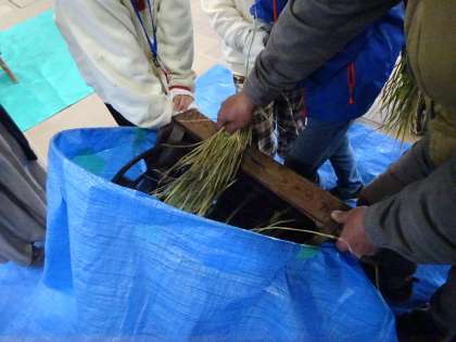 地域の先生から昔ながらの道具を使って『脱穀』の仕方を学び、体験しました。