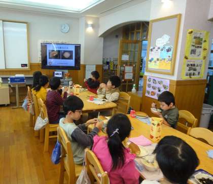 きのこのクリームシチューには、しいたけ・舞茸・エリンギがたくさん入っていました。きのこについてのクイズもあるムービーを見て、きのこについて詳しくなりました。香りがとてもよく、秋らしいシチューで体もぽかぽかになりました。