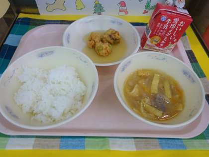 今日の給食は、ごはん・牛乳・がんもどきのあんかけ・豚汁でした。