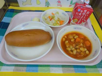 今日の給食は、黒糖コッペパン・牛乳・大豆と鶏肉のトマト煮・野菜のホットマリネでした。
