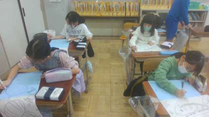 図画工作科の学習では、版に写す学習をしました。子どもたちは初めてのカーボン紙を使っての学習でなぞると版に写ってとても驚いている姿が見られました。落ち着いて丁寧に写すことができました。