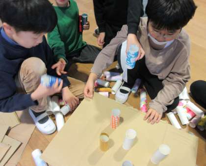 2月1日〜2月4日に行われる「小さな巨匠展」に向けて、第1回合同作品作りを本校で行いました。今年度の上京支部の合同作品のテーマは、タワーです!ダンボールやトイレットペーパーの芯等を使って、オリジナルのタワーを作ります。第1回の合同作品作りでは、始めに、小グループでタワーを作る活動を行ってから、みんなで大きなタワーを作って楽しみました。トイレットペーパーの芯の置き方や段ボールの大きさを考えながらタワーを作っていました。2回目の合同作品作りは、1月に本校で集まり、作品を作っていきます。どんな作品になるのか楽しみです!