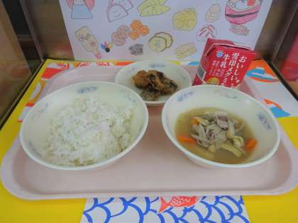 今日の給食は、麦ごはん・牛乳・いわしのこはくあげ・豚汁でした。豚汁には、人参・大根・ごぼうも入っていました。根菜がたっぷりで、体もポカポカになりました。