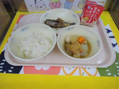 今日の給食は、麦ごはん・牛乳・いわしのしょうが煮・関東煮・いり豆でした。