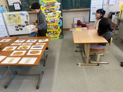 おひさま学級の校外学習(小さな巨匠展鑑賞、満足稲荷神社、買い物学習、平安神宮、岡崎公園、みやこめっせ見学)に向けて、昨年度、自分たちで調べて岡崎方面へ出かける学習を行いましたので、その時学習したことを思い出しながら自分たちで行き方を調べたり友だちと話し合いながら今年行きたい場所を決めたりしていました。そして、算数の時間に、教室に模擬店を作り、店員さん役、お客さん役になって買い物学習を行いました。
