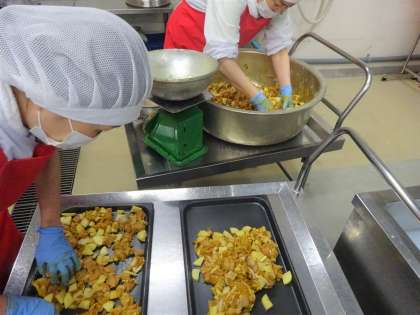 カレー粉、塩、ケチャップ、にんにく、醤油で作った調味液に鶏肉を漬込み、米粉を加えて、じゃがいもと混ぜてから、スチームコンベクションオーブンで焼きました。