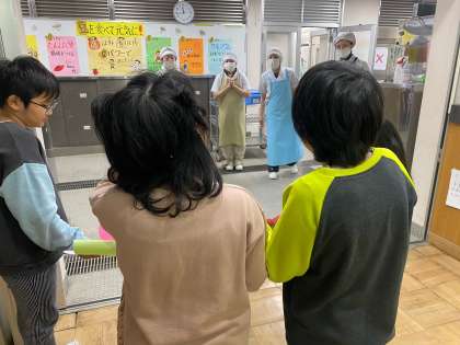 おひさま学級 「給食週間」 公開日 2024/02/09 更新日 2024/02/09 おひさま学級 今週は、給食について考える給食週間を行いました。給食調理員のみなさんや栄養教諭の東先生など給食に関わる方への感謝の気持ちを手紙に書き、一人ひとりの好きな給食を画用紙で作り、手紙の横に添えました。手紙や作品を模造紙にまとめ、渡しに行きました。「ビーフシチューがおいしかったよ。ありがとうございます。」や「カレーが好きです。また作って下さい。」と言葉を添えながら子どもたちは渡していました。