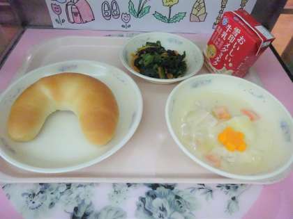 今日の給食は、バタークロワッサン・牛乳・じゃがいものクリームシチュー・ほうれん草のソテーでした。