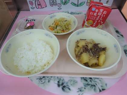 今日の給食は、ごはん・牛乳・肉じゃが・ごま酢煮・桜もちでした。肉じゃがは、じゃがいもがホクホクしていました。久しぶりの肉じゃがの登場に、大喜びでした。