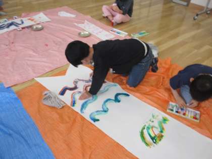 一人一人が思い思いに、絵の具とスポンジを使って、うろこの形を描いたり、枠に沿ってスタンプしたりしました。