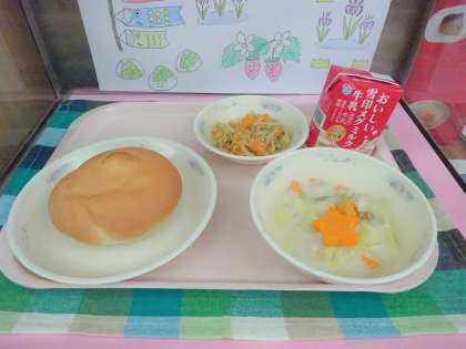 今日の給食は、バターうずまきパン・牛乳・キャベツの米粉クリーム煮・ツナともやしのカレーソテーでした。