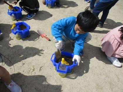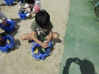 運動場でミニトマトを植えました。土を耕したり苗を植えたり肥料まいて水をあげたりすることができました。子どもたちは自分の苗を楽しみながら植えている姿が見られました。大きくなるのが楽しみですね。