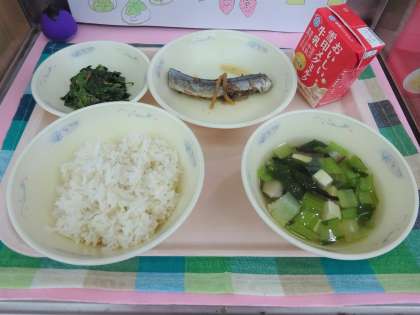 5月20日(月)の給食は、麦ごはん・牛乳・さんまのしょうが煮・ほうれん草のおかか煮・すまし汁でした。
