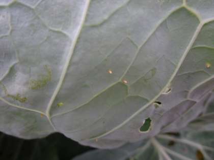 キャベツの裏にモンシロチョウの卵らしきものがあります。