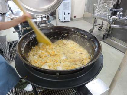 はるさめのいためものは、玉ねぎ・にんじん・もやしと、甘辛く炊いたしいたけ、はるさめが入っていました。写真は、たっぷりの具材をしっかりと混ぜている様子です。はるさめのつるっとした食感と野菜のシャキシャキした食感の違いを楽しみました。