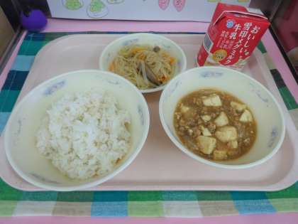 今日の給食は、麦ごはん・牛乳・マーボどうふ・はるさめのいためものでした。
