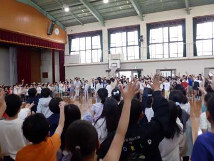1年生をむかえる会がありました。まず、児童会の子たちが全校遊びを考えてくれ、みんなでじゃんけんをして楽しみました。
