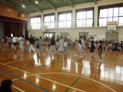 入場は、2〜6年生が拍手で迎えてくれる中、6年生に手をつないでもらって入場しました。少し緊張した表情の子もいましたが、「どんなことをするのかな。」とわくわくしながら歩きました。