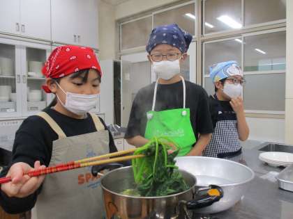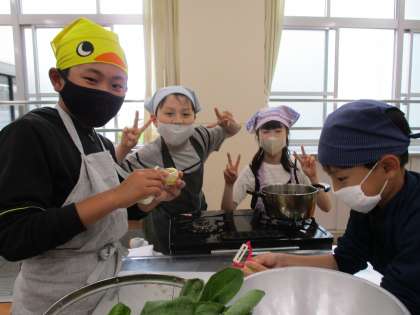 今日は家庭科室にて、5年家庭科「ゆでる調理でおいしさ発見」の学習で青菜のおひたし・ゆでいもを調理しました。みんなで材料と分量、準備する用具や食器、洗い方、ゆで方、切り方、盛り付け、試食、片付けなどを確認した後、子どもたちは安全に気を付け、協力しながら調理実習を行いました。「自分で作った料理はすごくおいしく感じる!」や「料理って大変だ。」などの感想が聞かれました。これからも調理の楽しさを体験していってほしいと思います。