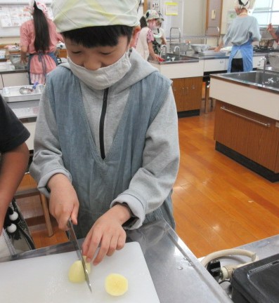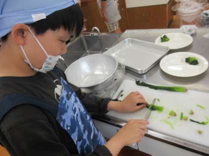 「青菜とじゃがいもを茹でよう」で、ほうれんそうとじゃがいもをゆでる学習をしました。手順を確認しながら、グループの友達と協力して作ることができました。