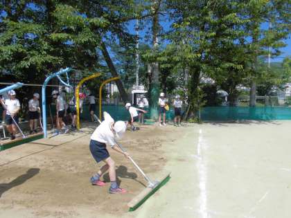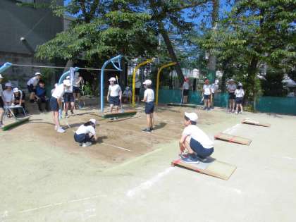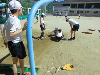 体育では「走りはばとび」の学習をしています。最初は、思うように跳べなかった子も、友達からアドバイスをもらったり、自分たちで考えて場を工夫したりすることで、最高記録を日々更新するようになってきました。次の人が跳びやすいように自分たちで砂もならします。安全に気を付けて学習していきます。