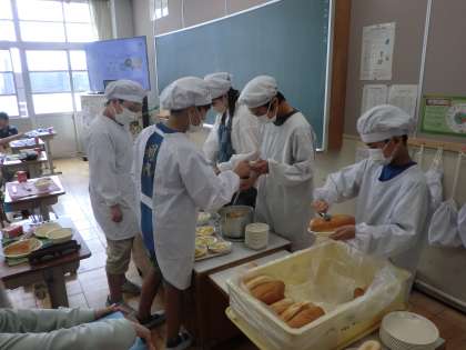 くじびきを引きながら,「今日の当番は何かな〜」と楽しんで当番活動に取り組んでいます。できるだけ均等になるように、余ったり足りなくなったりしないように、量に気を付けながら丁寧に配膳しています。