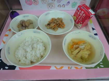 6月6日(木)の給食は、麦ごはん・牛乳・おからそぼろ丼(具)・里いもとこんにゃくの土佐煮・キャベツのすまし汁でした。