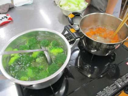5年生は、今週の木曜日と金曜日に「ゆで野菜サラダ」の調理実習を実施しました。