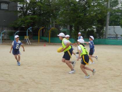6年生 体育科〜タグラグビー〜 公開日 2024/06/18 更新日 2024/06/18 6年生のページ タグラグビーの学習が今日で終わりました。くり返し練習していたこともあり、パスの出し方や受け方が上手になりました。