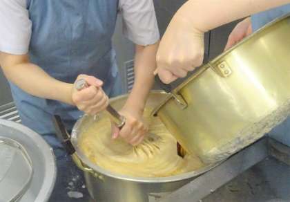 ういろうは、江戸時代から伝わる和菓子です。米粉・黒砂糖・砂糖を混ぜて、一つずつカップに入れてスチームコンベクションオーブンで蒸して作りました。調理員さんの手作りです。