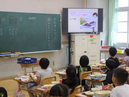 京都では6月30日に水無月を食べる文化があります。水無月はういろうの上に小豆がのっていることや、水無月の形の由来などムービーを通して学びました。今日のういろうも、手作りの優しい味が好評でした。