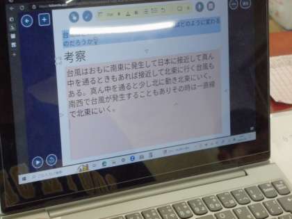 理科では台風の学習をしています。映像で見たり、調べたりしながら台風の動きについて考察を書きました。